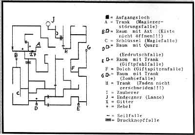 Gleich nach links durch die Tür. Klaut der rechten Ritterrüstung Helm und Handschuh und lauft durch das Wohnzimmer rüber zum Arbeitszimmer. In der Schublade des Schreibtisches liegt ein Vorhängeschloss und ein Gebetsbuch (Gedankenschild). Zurück im Wohnzimmer verwandelt man die Glasvasen in „Suchende Fallen“ - und ein Kohleneimer in einen „Schutzschild“-Spruch. Verlasst nun den Raum und erklimmt die rechte Treppe in den ersten Stock. Am linken Ende des langen Flurs führt euch die linke Tür ins Kinderzimmer. Krallt euch dort die Bauklötze und entfleucht erneut ins Wohnzimmer. Um den Geist vom Eingang zur Bibliothek wegzulocken, stellt man sich direkt vor das Gespenst, tritt einen Schritt zurück und legt einen Bauklotz auf den Boden. Sobald das Schwebende Bettlaken auf einen zustürmt, spurtet man zur Tür und öffnet diese schnell. Die dahinter befindliche Bibliothek bietet so dies und das an nützlichem oder schwachsinnigem Geschreibsel. Lesenswert sind hierbei nur die Bücher über Gifte und Dämonenbeschwörung. Die aus dem Giftmischerbuch herausflatternde Formel gut aufheben. Zurück in der Eingangshalle des Spukhauses sollte man vor der Treppe in den ersten Stock alle nicht benutzten Gegenstände horten. Behaltet jedoch immer einige Zauberzutaten für wichtige Sprüche wie Feuerbälle, Schutzzauber etc. zurück. Sprintet über den Friedhof zur Kapelle. Nehmt dorthin auf jeden Fall Waffen, Rüstungen, Reagenzgläser, Kruzifix, Kissen, Handtücher, Flaschen, einige Metallgegenstände, den Spiegel, Haarspray und die Zaubererverkleidung (aus Kostüm- und Make-up Raum) mit. In der Kapelle schnappt man sich das Gebetbuch (Vorsicht: für keinen Spruch verwenden), schmiedet sich schon mal etliche Zaubersprüche, füllt die Reagenzgläser mit Weihwasser und verwandelt gleich eines der gefüllten Gläser zusammen mit dem Kruzifix in einen „Segnen-Zauber“ dieser steigert die Schlagkräftigkeit unserer Waffen gewaltig. Verrückt nun das Rednerpult (einfach ins Inventory ziehen), öffnet die Falltür und steigt die Stufen hinab. Die angeketteten Wächterinnen sollten schleunigst ins Jenseits geschickt werden; dann die Steinplatte anheben und weiter nach unten steigen. Die einzelnen Ebenen sind voll gespickt mit allerlei Fallen. Seid also auf der Hut und bahnt euch am besten anhand unserer Karten den gefährlichen Weg durch die Dungeons. Im zweiten Level findet man einen magischen Dolch. Wendet auf diesen den „Frostklinge“-Zauber an - Ihr erhaltet die wirkungsvollste Waffe des gesamten Spiels. In einer Kiste der vierten Ebene fristen Fischgräten (Auftrieb-Spruch) ihr jämmerliches Dasein. Der Schlüssel für die Truhe liegt übrigens unter der danebenstehenden Kiste. Die Flaschen mit roter Flüssigkeit solltet ihr bei Mangel an Magiepunkten zu euch nehmen. Spätestens in der sechsten Ebene ist es an der Zeit, das Zaubererkostüm anzuziehen, denn hier begegnet uns der große Meistermagier persönlich. Da er uns für seinen Lehrling hält, hätte er ganz gerne gewusst, wo wir so lange gesteckt haben - erzählt ihm einfach, ihr hättet eine Fleischvergiftung gehabt. Der mächtige Zauberfuzzi scheint mit dieser Ausrede zufrieden und trollt sich seiner Wege. Im gleichen Level findet man auch Elvira, die sich jedoch als billige Kopie entpuppt - killt sie, krallt euch die Lanze und begebt euch zurück zur Kapelle. Noch bevor ihr sie betretet, ist es ratsam abzuspeichern, denn in der heiligen Stätte wartet bereits der Todesengel auf wackere Abenteurer wie euch. Um ihn zu plätten, startet man einen „Heilige-Barriere“-Zauber und schleudert dem Guten möglichst starke Angriffssprüche entgegen. Studiowechsel ist jetzt angesagt. Studio 1Macht einen kleinen Abstecher zu Eurem Lagerhaufen, um Euer Zauberspruchkonto wieder aufzubessern. Nehmt wie immer Rüstung, Waffen und außerdem das gelbe Pulver in der Flasche und die Nagelfeile mit. Nach dem letzten Dungeon-Trip wird euch dieser eher wie ein Kindergeburtstag vorkommen. Benutzt die unterwegs gefundenen Kristalle und Pilze für Zaubersprüche. Sucht als erstes den Lift und schaltet ihn ein. Im ersten Stock taucht man unter Zuhilfenahme eines „Unterwasseratmung“-Zaubers in die Tiefen des Sees, reißt sich unten das Seil unter den Nagel und spricht den „Auftrieb“-Zauber aus. Als nächstes metzelt man den Skorpion im zweiten Stock nieder. Die Bannrolle, die er bewacht hat, wird selbstverfreilich mitgenommen. An einem Schacht im vierten Stock ergreift ihr das rechte Seil, schwingt euch über das Loch und klickt auf den Durchgang, sobald ihr ihn erspäht. In dem dahinter liegenden Labyrinth trefft ihr auf den in einem Spinnenkokon eingewebten Regisseur. Seine Brieftasche wandert mittels „Telekinese“ in unseren Besitz, der darin enthaltene Schlüssel öffnet die Fahrstuhltüren. Doch bevor wir uns dem Lift widmen, lenken wir uns dem Lift widmen, lenken wir die Aufmerksamkeit der Spinne auf uns. Durch einen kleinen Eisdolch veranlassen wir das Biest uns zu verfolgen. Wer Lust hat, darf die Spinne jetzt mit allen möglichen Kampfzaubersprüchen in die Knie zwingen; wer dem Ungeziefer lieber kampflos entkommen möchte, sollte sie zum Aufzug locken, durch die beiden Türen hindurchgehen und diese auch gleich wieder hinter sich schließen. Egal wie Ihr euch entscheidet, hinter den beiden Lifttüren geht´s weiter bis zu einem Loch in der Wand. Springt hier nach unten ins Netz der Spinne, tötet das zweite Elvira-Plagiat, schnappt euch den Tomahawk, lasst euch aus dem Netz fallen und verlasst das Studio. Das Finale